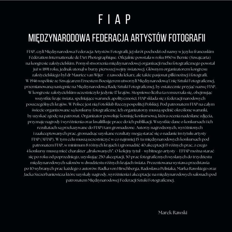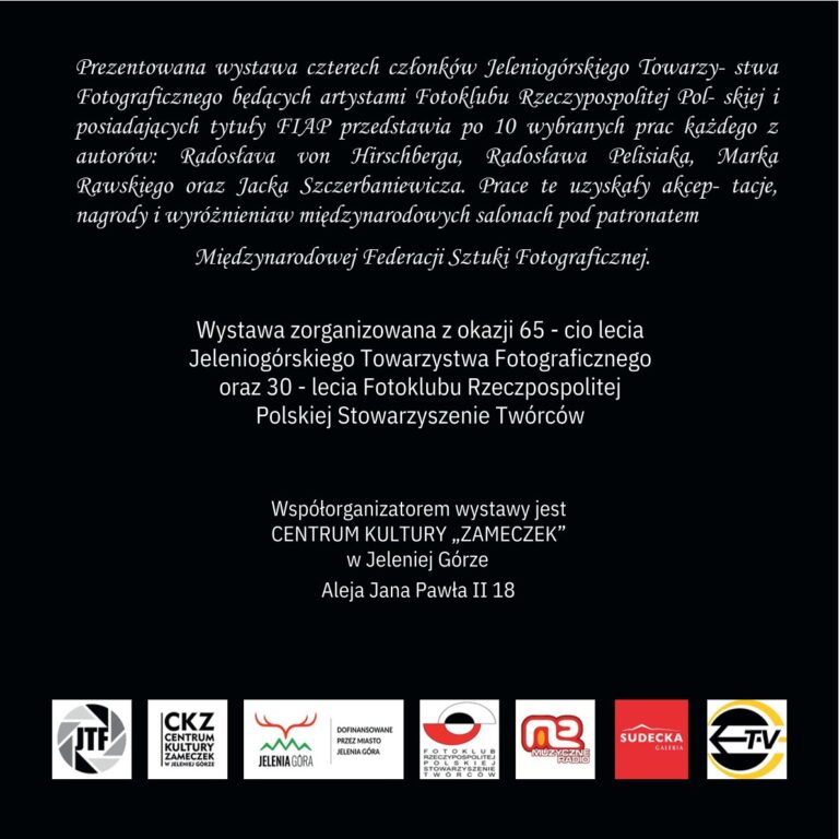 Centrum Kultury Zameczek w Jeleniej Górze zaprasza na wyjątkową wystawę fotografii, podczas której zaprezentowane zostaną prace artystów Fotoklubu Rzeczypospolitej Polskiej – Stowarzyszenia Twórców, posiadających tytuły Międzynarodowej Federacji Sztuki Fotograficznej (FIAP):