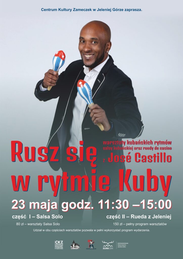 13:30 – 15:00 Część II – Rueda z Jeleniej: warsztaty inspirowane kubańską ruedą de casino – tańcem wykonywanym w kręgu. Podczas zajęć uczestnicy poznają: podstawy tańca w parze, pierwsze figury ruedy, wspólny taniec w kręgu